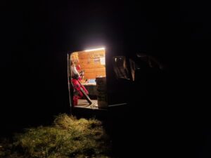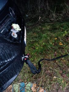 Owszem dwa razy udało się wyjechać i wyprowadzić Busa z błota, ale nie tym razem. Utknęliśmy w krzakach po ciemku, zbaczając z drogi. Dla mnie już nie było szans na wyciągnięcie busa w pojedynkę. Teoretycznie mogłabym „bawić się” dalej. Może więcej gałęzi, a może jakaś teleporada a może finalnie jakiś pomysł przyszedłby do głowy? Opcjonalnie nawet nocleg w tym miejscu nie byłby problematyczny, gdybym miała poszukiwać pomocy kolejnego dnia. Z perspektywy Busa było to całkiem ciekawe miejsce na nocleg. Mieliśmy z pieskami na pace wszystko do życia, a oczywiste było, że za dnia wiele spraw wygląda mniej krytycznie, niż pod osłoną nocy. Auto nie miało żadnej awarii. Ot utknęliśmy. Rano mogłabym na spokojnie pobiec do pobliskiej wioski po miejscowego z traktorem czy nawet podjechać Cyferką, która wciąż była na pace…