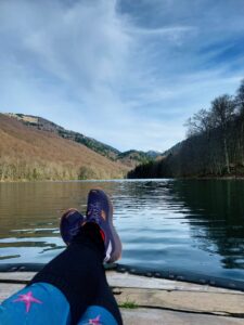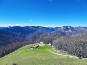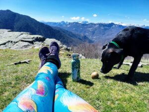 Końcówkę łatwym (choć nadal pod górkę) terenem doszliśmy z Fifim na szczyt. To piękny moment, kiedy mogłam w dole zobaczyć drogę, którą jeszcze wczoraj przejeżdżałam. Z tej perspektywy puzzle krajobrazu stworzyły kompletny obraz. Zostaliśmy chwilę korzystając z nadal pięknej pogody i wpatrując w panoramę raz to ośnieżonych raz to rozgrzanych już słońcem szczytów. Widoczność była tak dobra, że te wszystkie wierzchołki na horyzoncie mogły być szczytami dzielącymi Śavnik od Kolaśina. Może tam w oddali był też początek Parku Durmitor, który podobnie jak rzeka Tara przypomina, że Bus Pełen Przygód już prawie zatoczył koło po Czarnogórze…