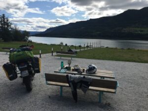 Ostatecznie na nocleg zamelodwałam się nad jeziorem Oyeren przed Oslo. Wieczorna, sprzyjająca pogoda, wiatr, słońce i rozchodzące się kłęby chmur pozwoliły zmokniętym ciuchom wyschnąć, a rano mogłam ruszyć w pełnym komforcie.