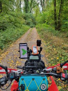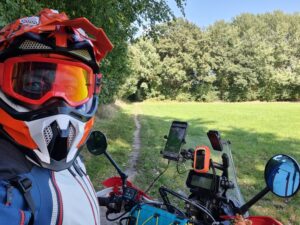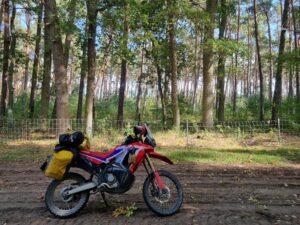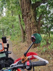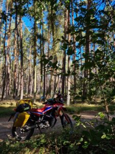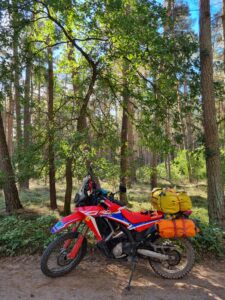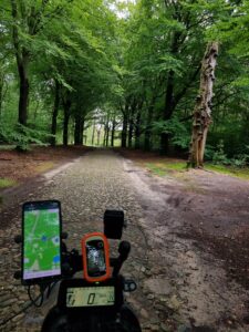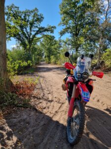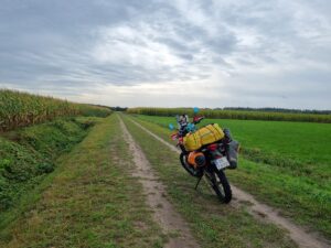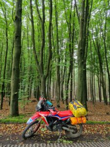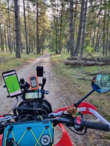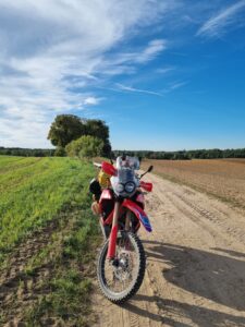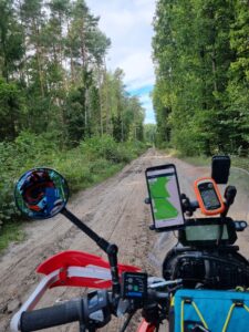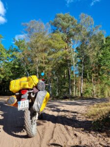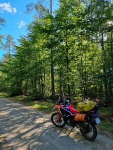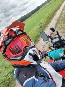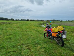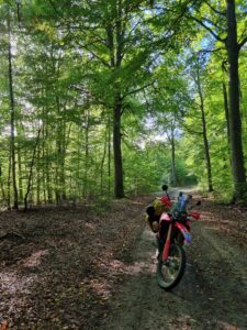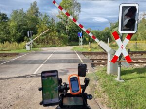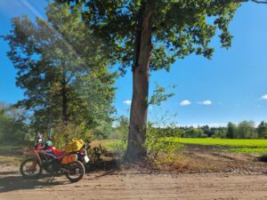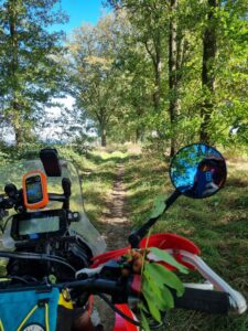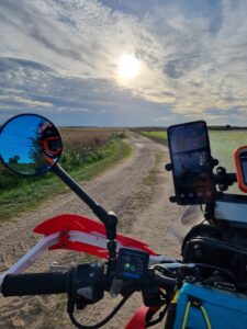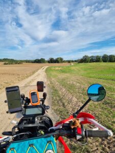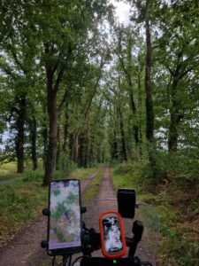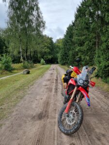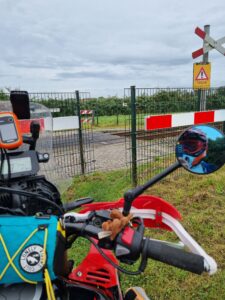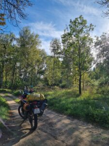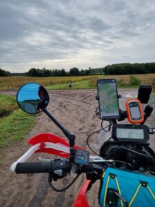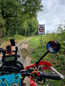 I rzeczywiście pomięty wcześniej odcinek okazał się ciekawym fragmentem tego średnio-atrakcyjnego dla poza asfaltowego entuzjasty kraju. Już od startu wpakowałyśmy się z Cyferką w mokre pole, za chwilę błoto oraz nieoczywiste przejście kolejowe, które zdaje się być dostępne dla motocykli tylko za przyzwoleniem sympatyków TET. Świetny odcinek i o dziwo zaskakująco mało jak na tę część Europy przeklętego asfaltu. Udało się też znaleźć trochę lasu, który nawet przypominał wyglądem las, a nie jedynie zagubione pojedyncze drzewa gdzieś wzdłuż drogi. Dalsze odcinki trasy pokazały, że w tym małym płaskim kraju jest miejsce dla wszystkich.