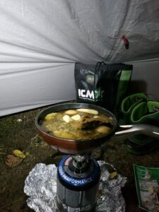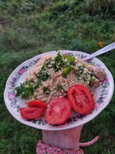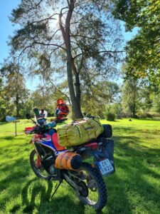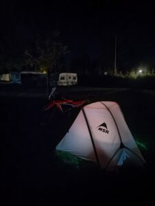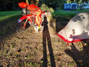 Wieczorem pewien pan z zapytał, czy nie jest zimno, że podobno ostatniej nocy były 2 stopnie. Przez lata udało mi się zgromadzić trochę dobrego sprzętu biwakowego, więc temperatura nie stanowiła problemu, nawet gdyby rzeczywiście miały być tylko 2 stopnie. Ale o sprzęcie opowiem kiedy indziej. Zaproponował też podpięcie się do prądu, gdybym potrzebowała, a akurat to było potrzebne, bo w motocyklu dodatkowe ładownie nadal wariowało…