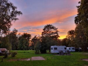 Na wieczór dotarłyśmy do zaznaczongo wcześniej na mapie campingu już nad rzeką Elde i na szczęście okazał się czynny a przemiła Pani z obsługi, choć nie mówiła po angielsku bardzo pomocna. Wskazała, by rozbić namiot przed werandą czyjejś przyczepy. To jedna z tych przyczep gdzie przed wejściem jest wrośnięty taras, meble ogrodowe daszek i doniczki z kwiatkami. Zapewniała jednak, że nikt tam nie przyjedzie, a to właściwe miejsce.
