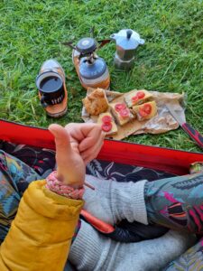 Dokładnie w miejscu, które wskazała Pani z obsługi, słońce miało pojawić się najwcześniej z rana… I rzeczywiście tak było. Plama porannego światła padła prosto na namiot umilając leniwy start kolejnego dnia, choć dookoła jeszcze cień drzew zasłaniał okolice, a w większości puste kampingi sprawiały wrażenie opuszczonych od lat.