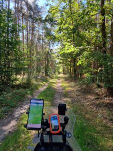 Udało się uniknąć spektakularnej gleby na piasku, który przy dość odczuwalnej prędkości jednak stał się grząski, a Cyferka zaczęła podejrzanie tańczyć. No ale uff, dałyśmy radę. Ale już kilka kilometrów dalej w lesie pewien korzeń pokazał nam, żeby jednak zwolnić. Dodatkowo okazało się, że i tak zgubiłyśmy drogę. Na tym etapie zorientowałam się, że ta bardzo atrakcyjnie wyglądająca i zdecydowanie zachęcająca ścieżka, która skręcała w las chyba jednak nie do końca była tak legalna jak mi się początkowo wydawało, ale tego już się nigdy nie dowiem i nawet nie chcę.