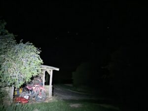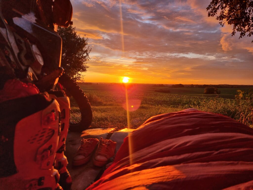Wreszcie kilkanaście kilometrów dalej zaczęłam wypatrywać wiatki. I tak na skrzyżowaniu polnych i leśnych dróg, trochę z boku tuż za większymi krzakami kryła się ona. W idealnym miejscu. Schowana od drogi, a jednocześnie blisko i z widokiem na rozprzestrzeniający się krajobraz. To miejsce naprawdę różniło się od wielu innych napotkanych na zachodniej części Niemiec, gdzie lasów prawie nie ma, a drogi zalane asfaltem albo prywatne. Tu było ciekawej… Szybka analiza pozwoliła określić, że wiatka jest otwarta w stronę wschodu, więc jeśli pogoda pozwoli, powinnyśmy mieć z Cyferką widowiskową pobudkę.